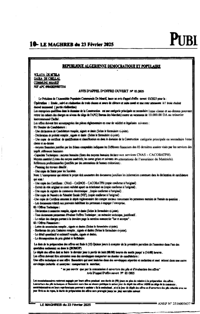 إعلان عن طلب عروض مفتوح 2025/03 بلدية معاريف