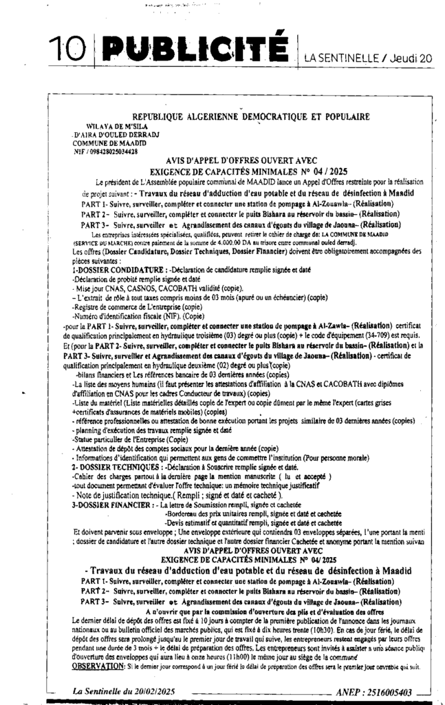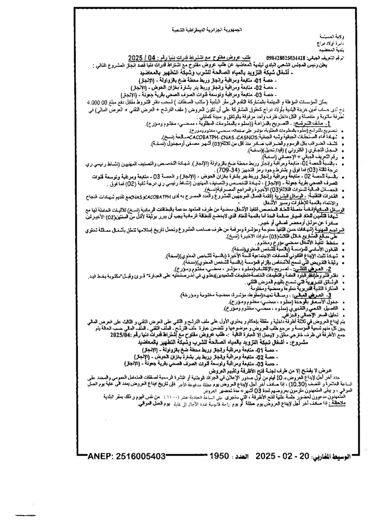 إعلان عن طلب عروض مفتوح 2025/04 بلدية المعاضيد