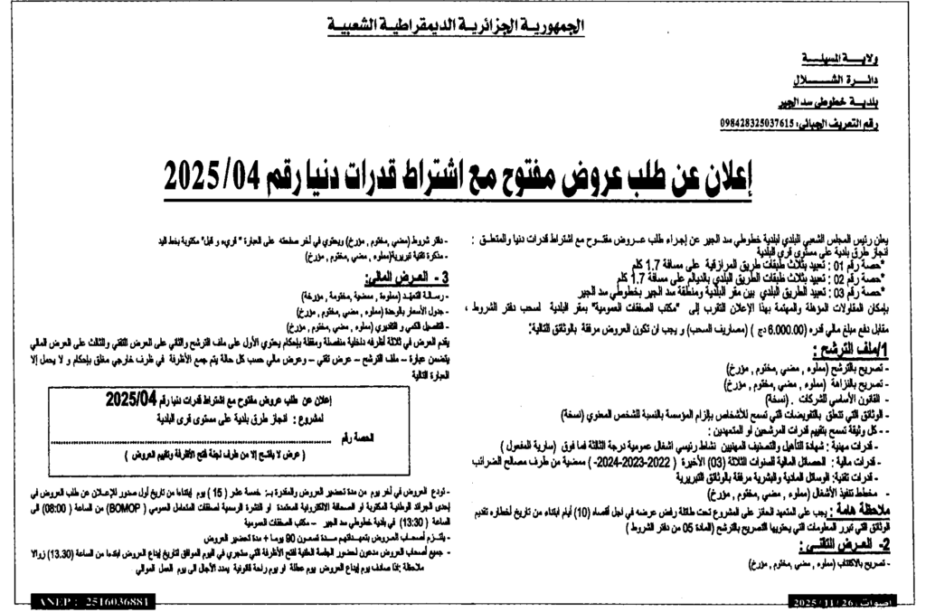 إعلان عن طلب عروض مفتوح 2025/04 بلدية خطوطي سد الجير