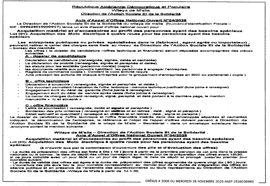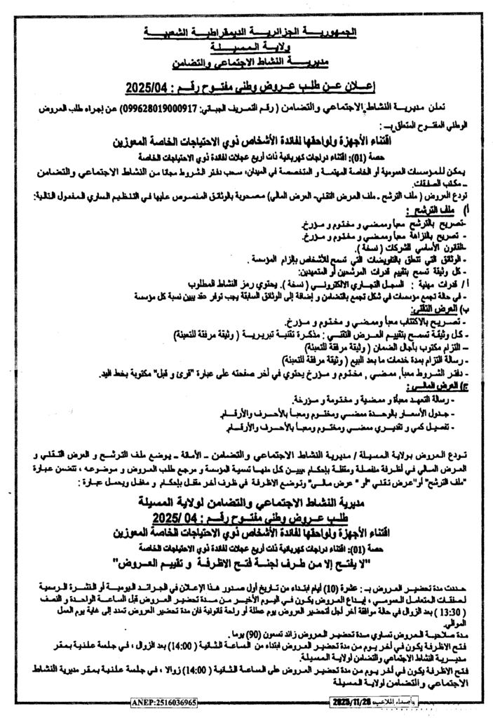 إعلان عن طلب عروض مفتوح 2025/04 مديرية النشاط الاجتماعي والتضامن لولاية المسيلة