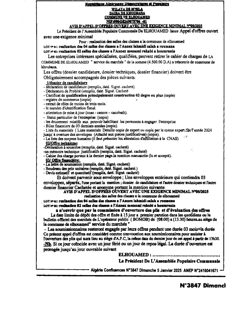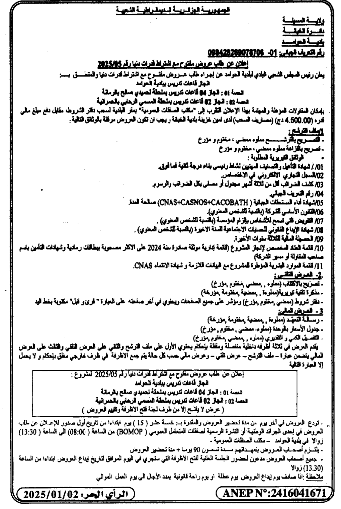 إعلان عن طلب عروض مفتوح 2025/05 بلدية الحوامد