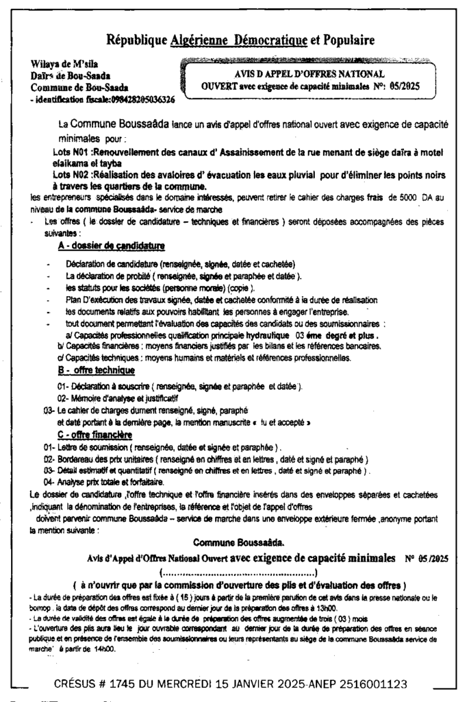 إعلان عن طلب عروض مفتوح 2025/05 بلدية بوسعادة