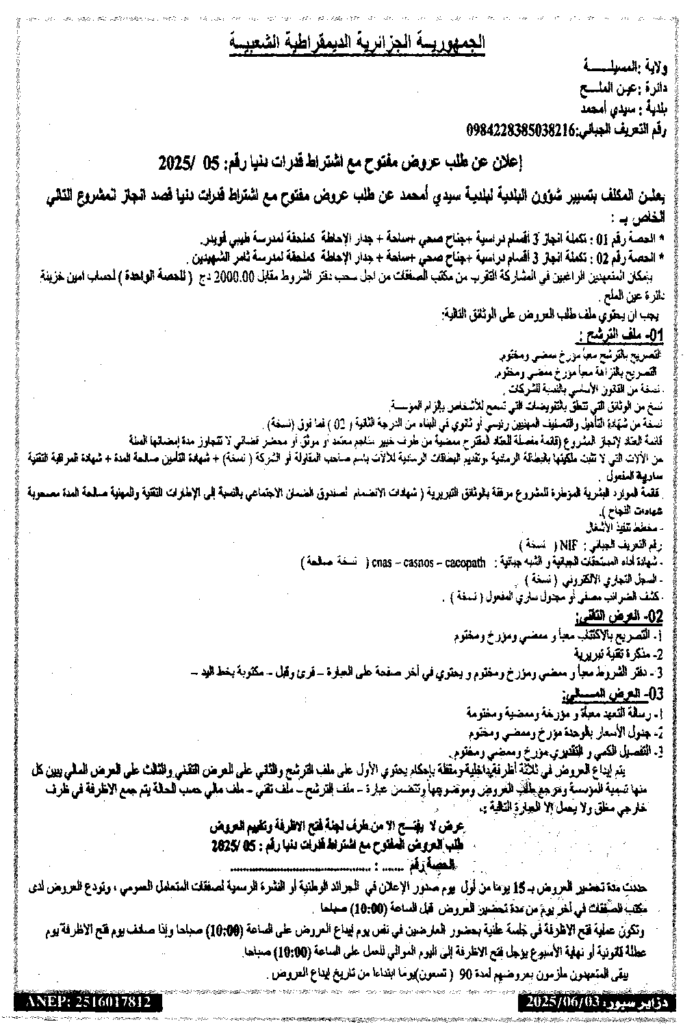 تكملة انجاز 03 أقسام دراسية + جناح صحي + ساحة + جدار الإحاطة كملحقة لمدرستي طيبي قويدر وثامر الشهينين4 يونيو، 20250 19 شاركها فيسبوك X مشاركة عبر البريد طباعة