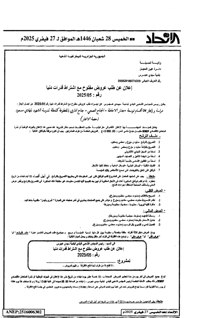 إعلان عن طلب عروض مفتوح 2025/05 بلدية سيدي هجرس