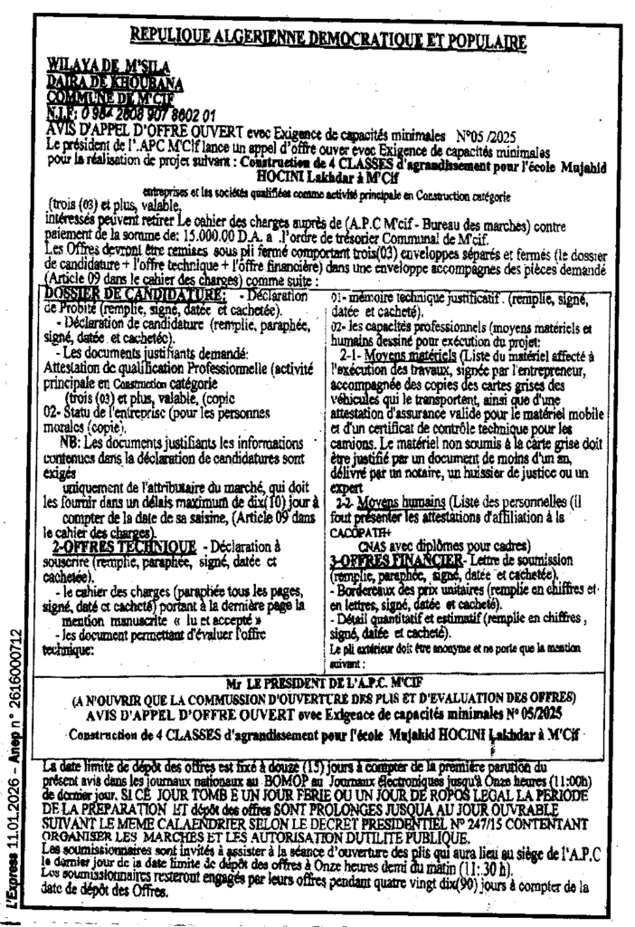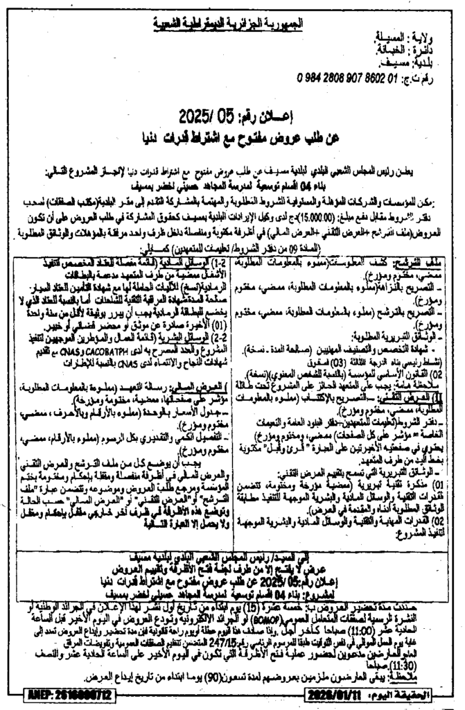 إعلان عن طلب عروض مفتوح 2025/05 بلدية مسيف