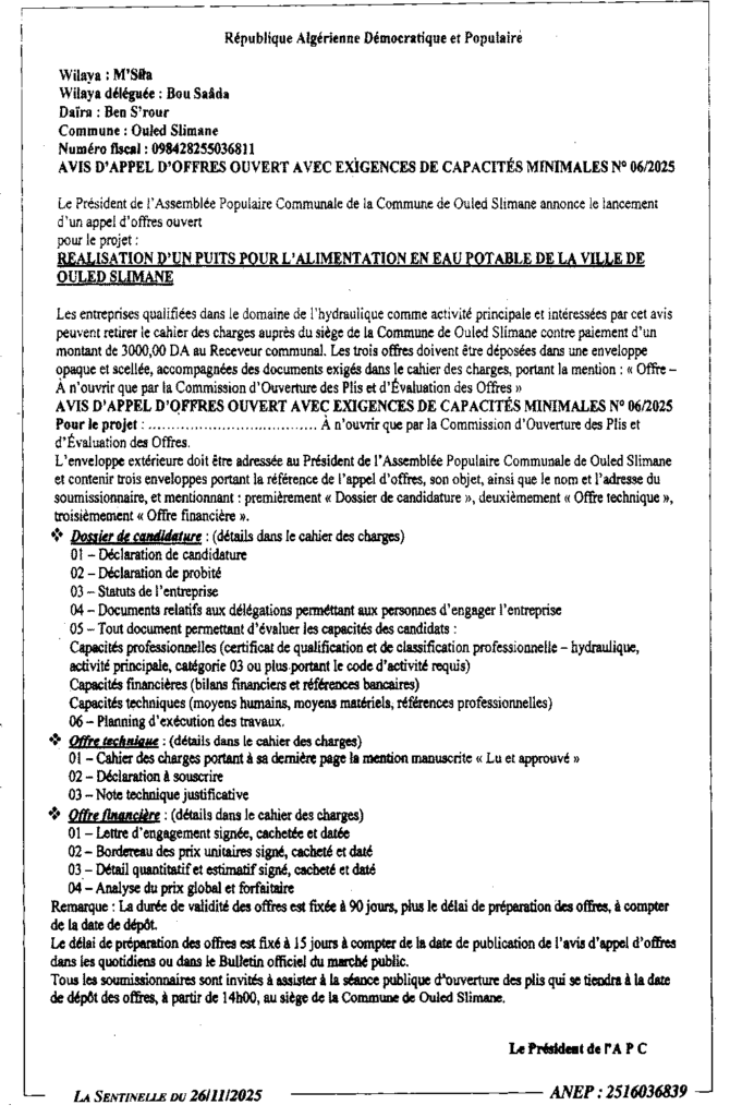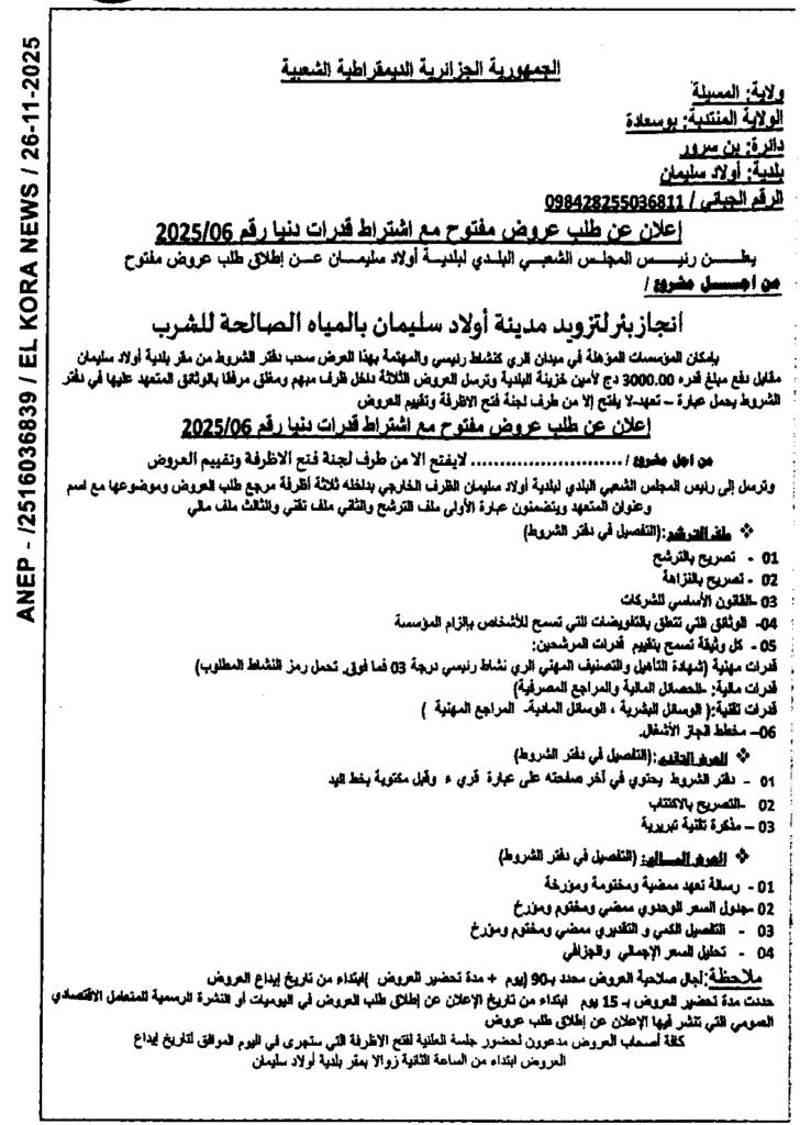إعلان عن طلب عروض مفتوح 2025/06 بلدية أولاد سليمان