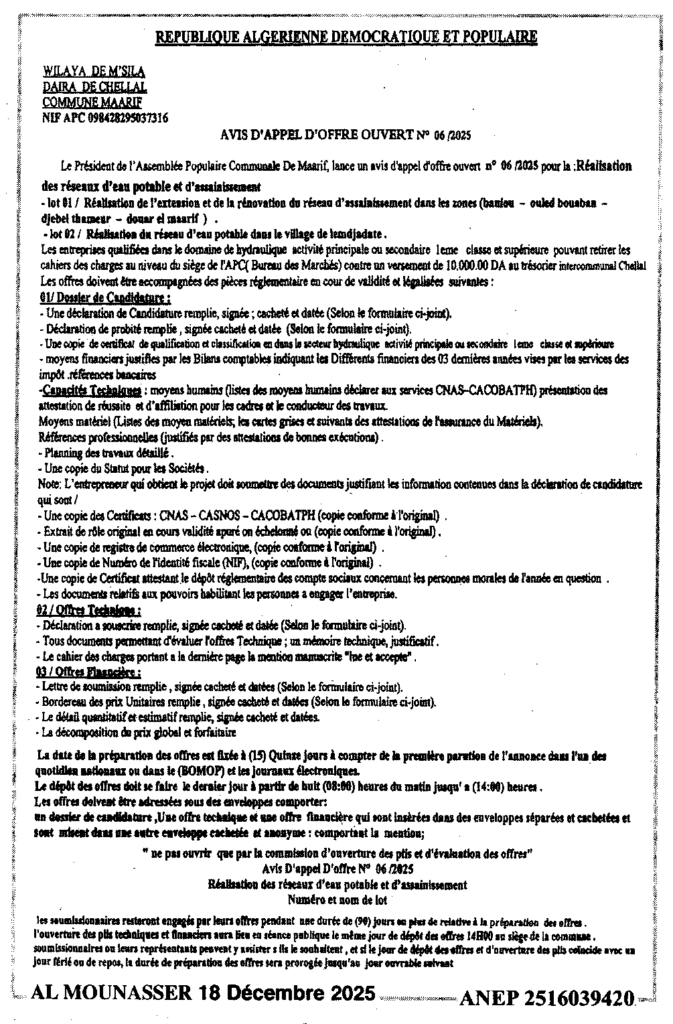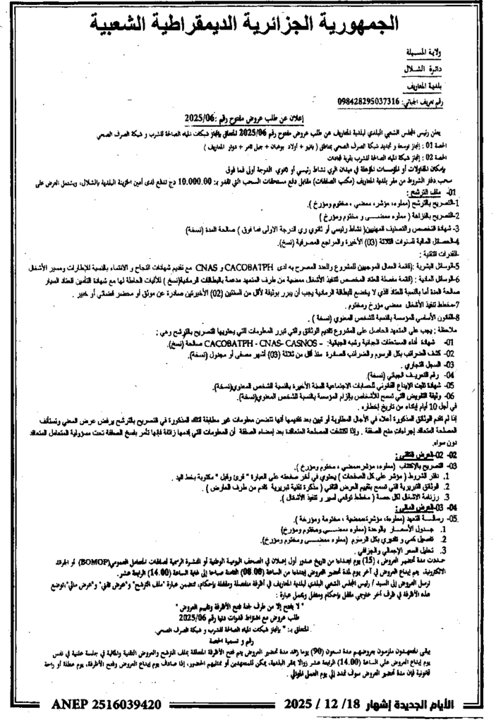 إعلان عن طلب عروض مفتوح 2025/06 بلدية المعاريف