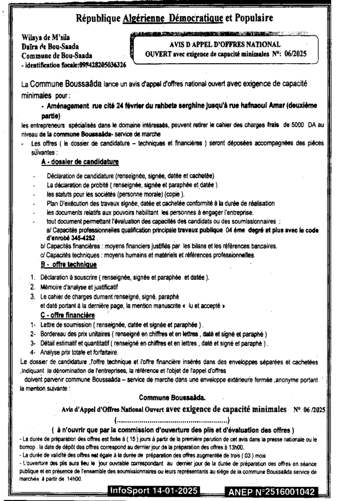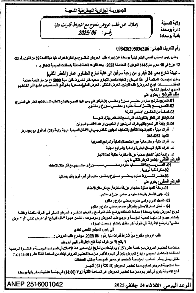 إعلان عن طلب عروض مفتوح 2025/06 بلدية بوسعادة