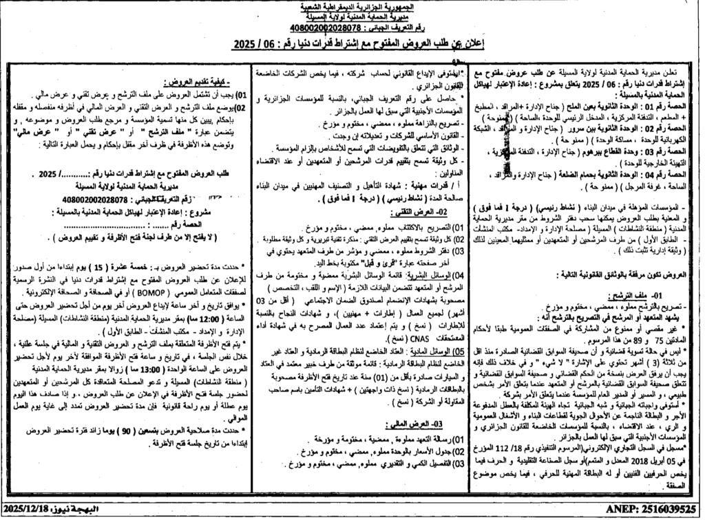 إعلان عن طلب عروض مفتوح 2025/06 مديرية الحماية المدنية لولاية المسيلة