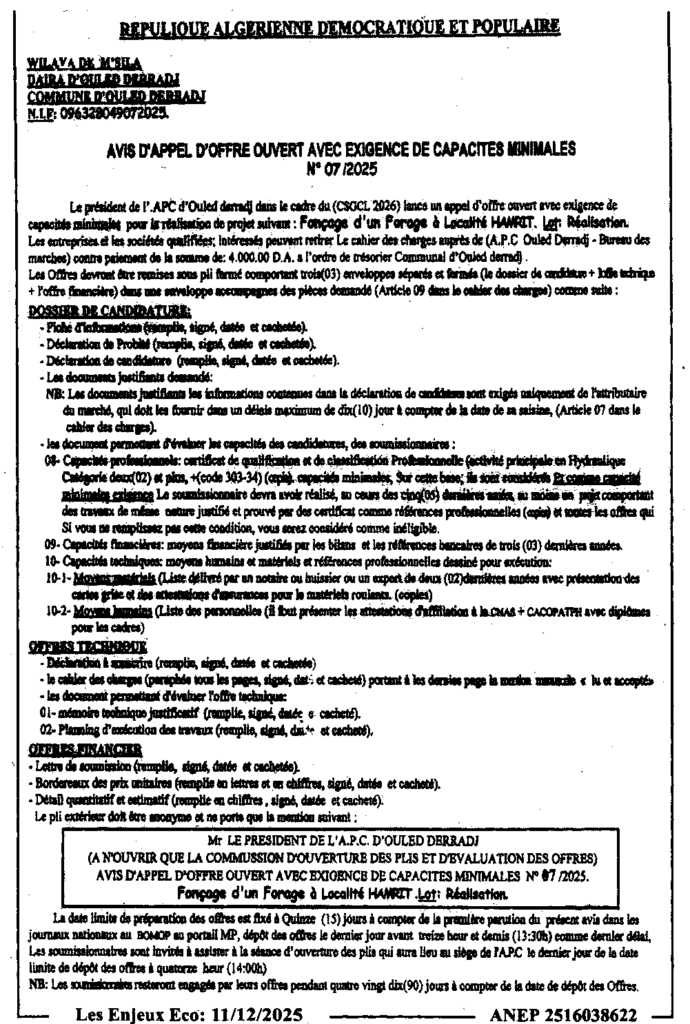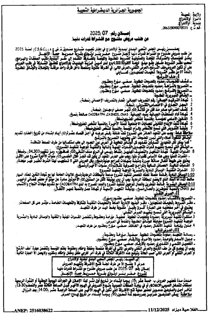 إعلان عن طلب عروض مفتوح 2025/07 بلدية أولاد دراج
