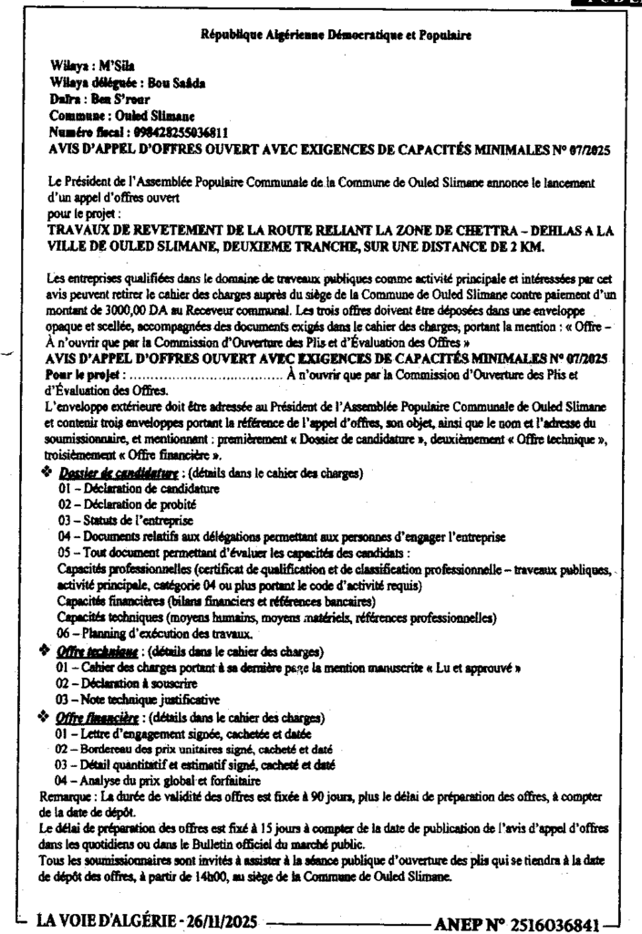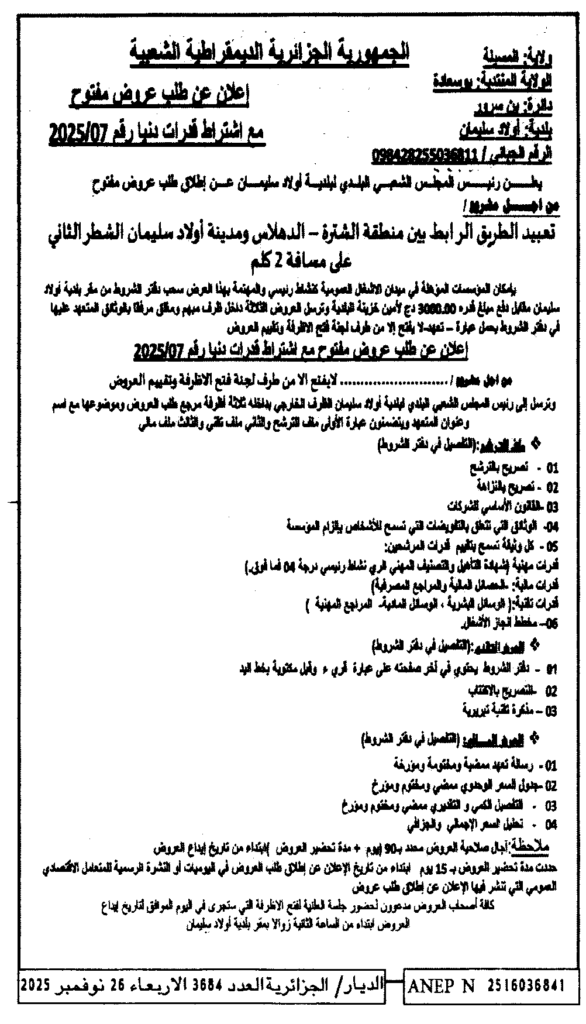 إعلان عن طلب عروض مفتوح 2025/07 بلدية أولاد سليمان