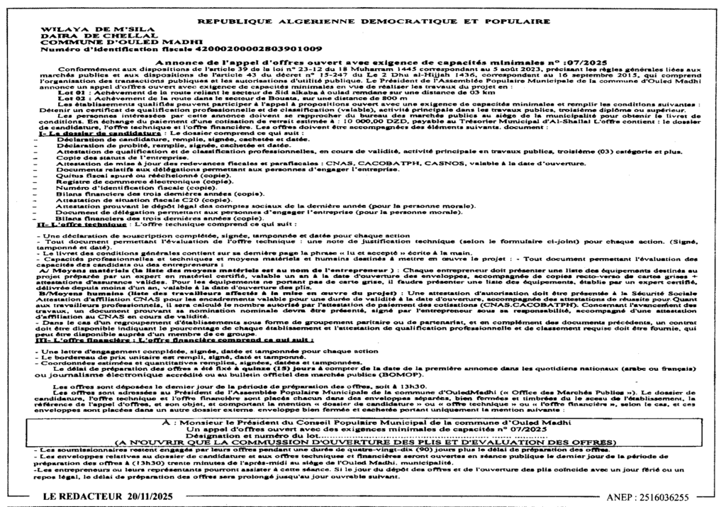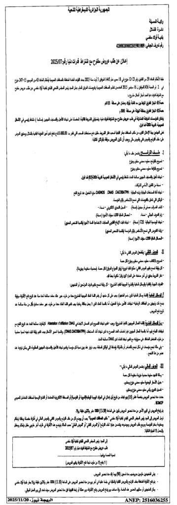 إعلان عن طلب عروض مفتوح 2025/07 بلدية أولاد ماضي