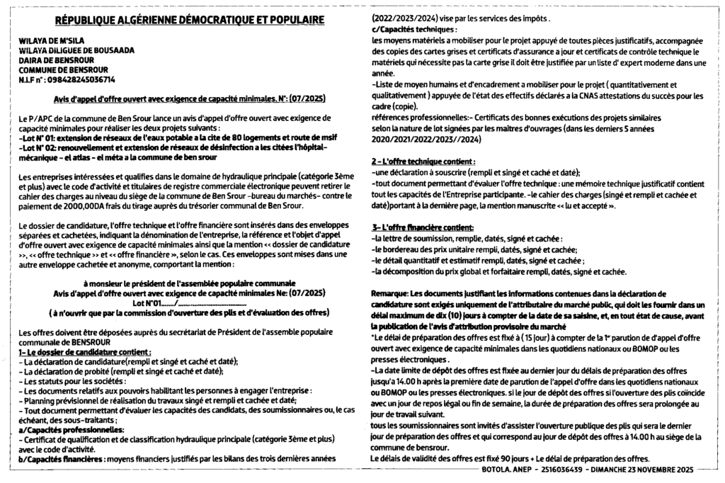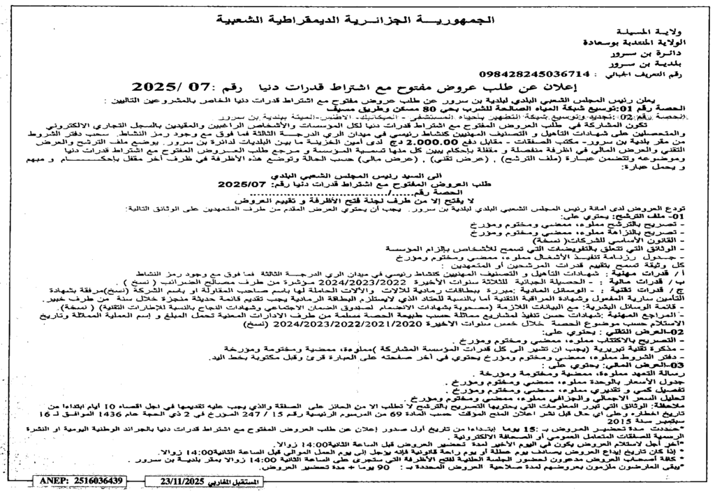 إعلان عن طلب عروض مفتوح 2025/07 بلدية بن سرور