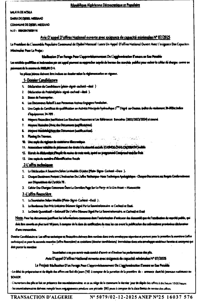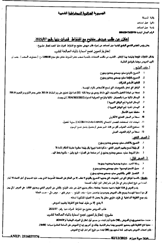 إعلان عن طلب عروض مفتوح 2025/07 بلدية جبل امساعد