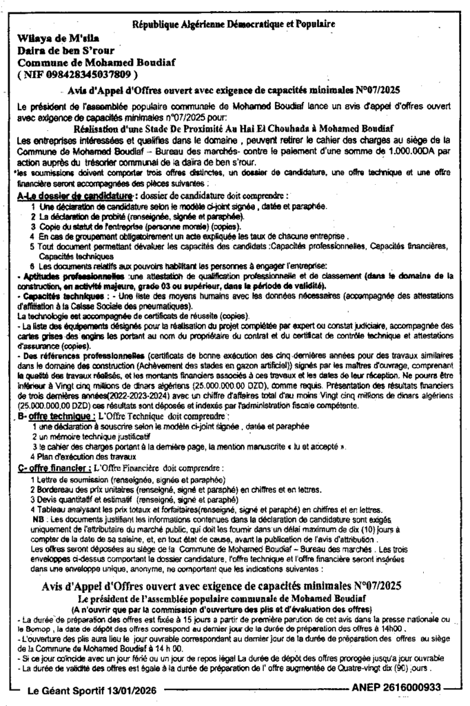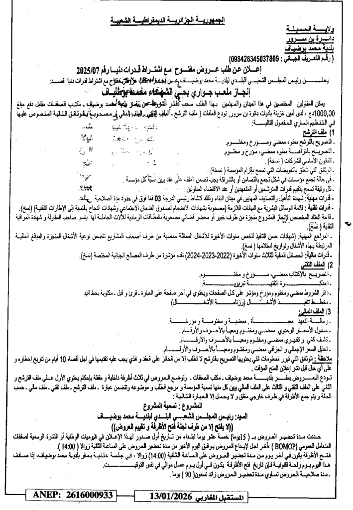 إعلان عن طلب عروض مفتوح 2025/07 بلدية محمد بوضياف