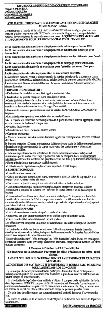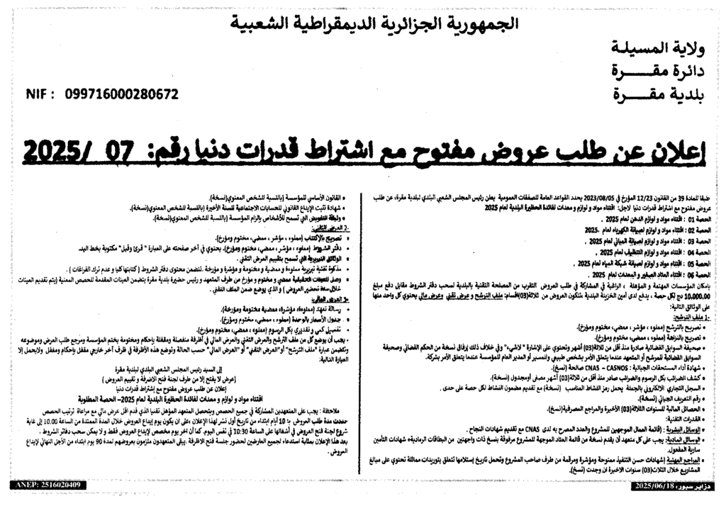 اقتناء مواد ولوازم ومعدات لفائدة الحضيرة البلدية لعام 202518 يونيو، 20250 31 شاركها فيسبوك X مشاركة عبر البريد طباعة