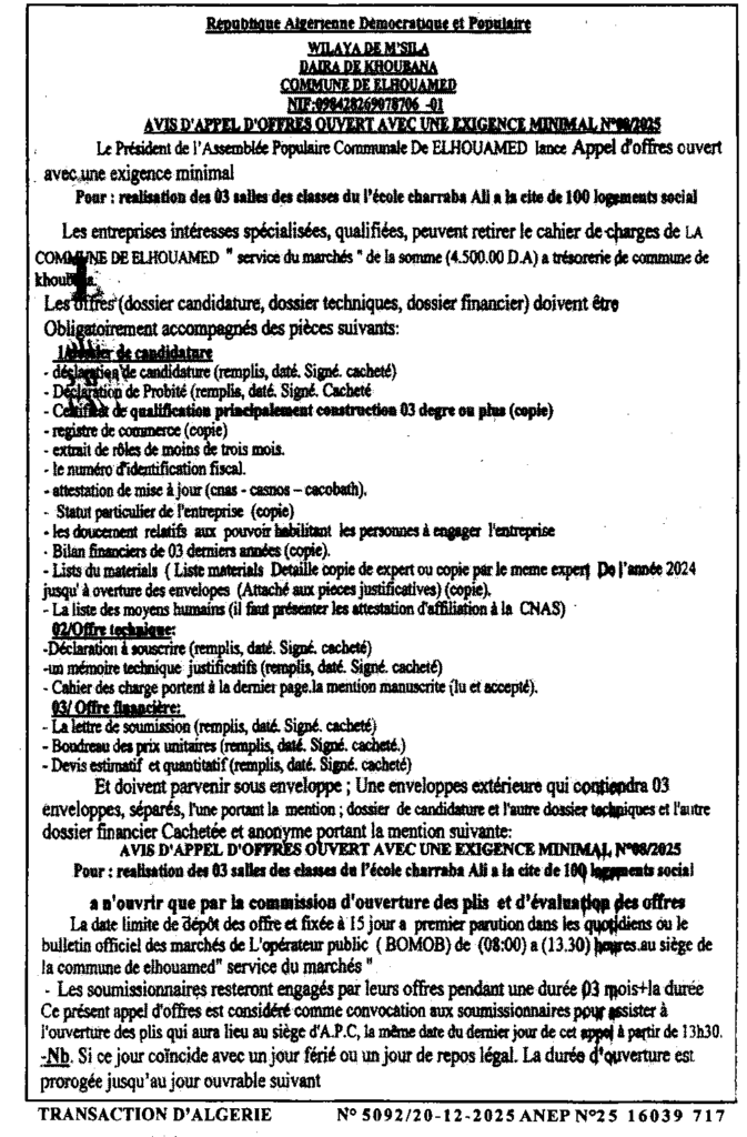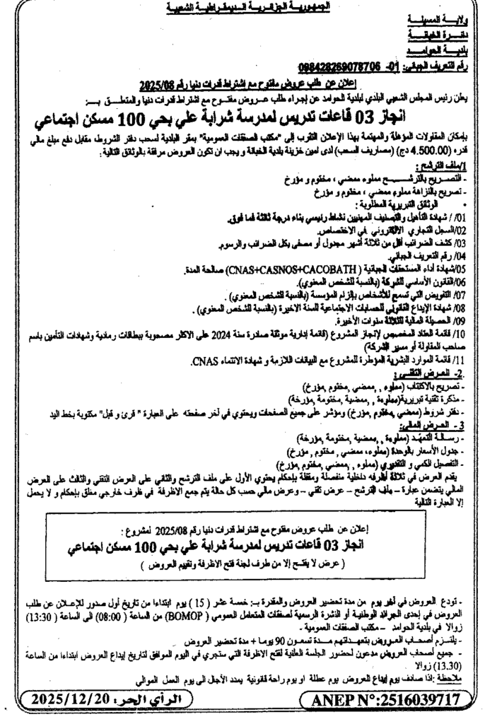 إعلان عن طلب عروض مفتوح 2025/08 بلدية الحوامد