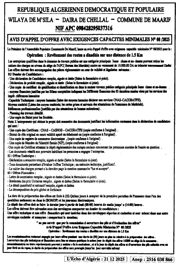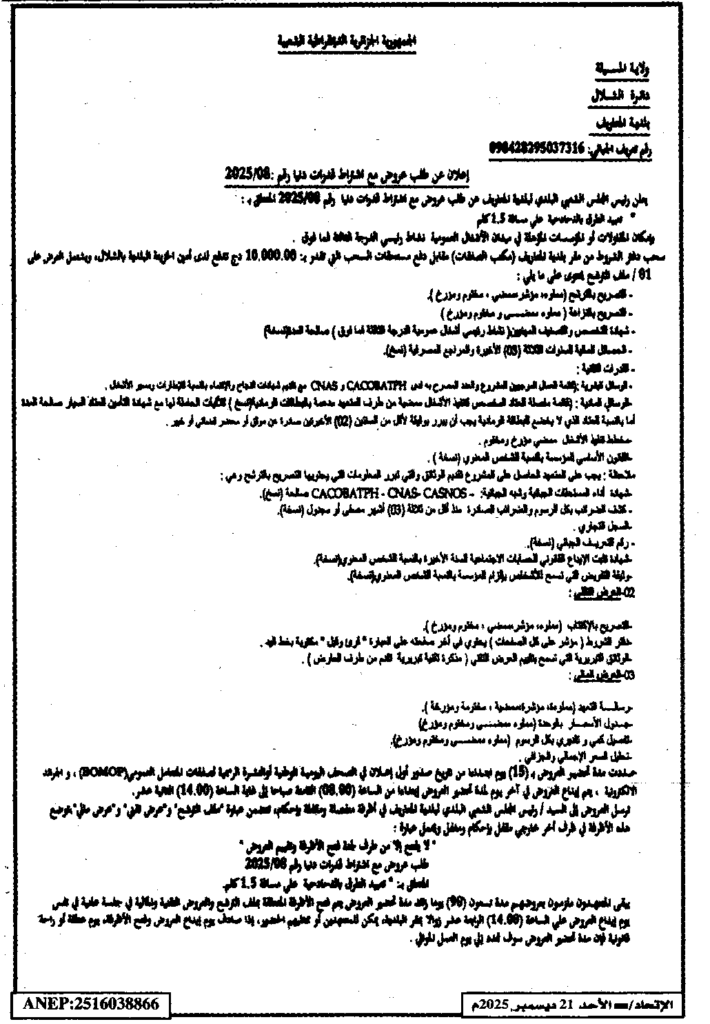 إعلان عن طلب عروض مفتوح 2025/08 بلدية المعاريف