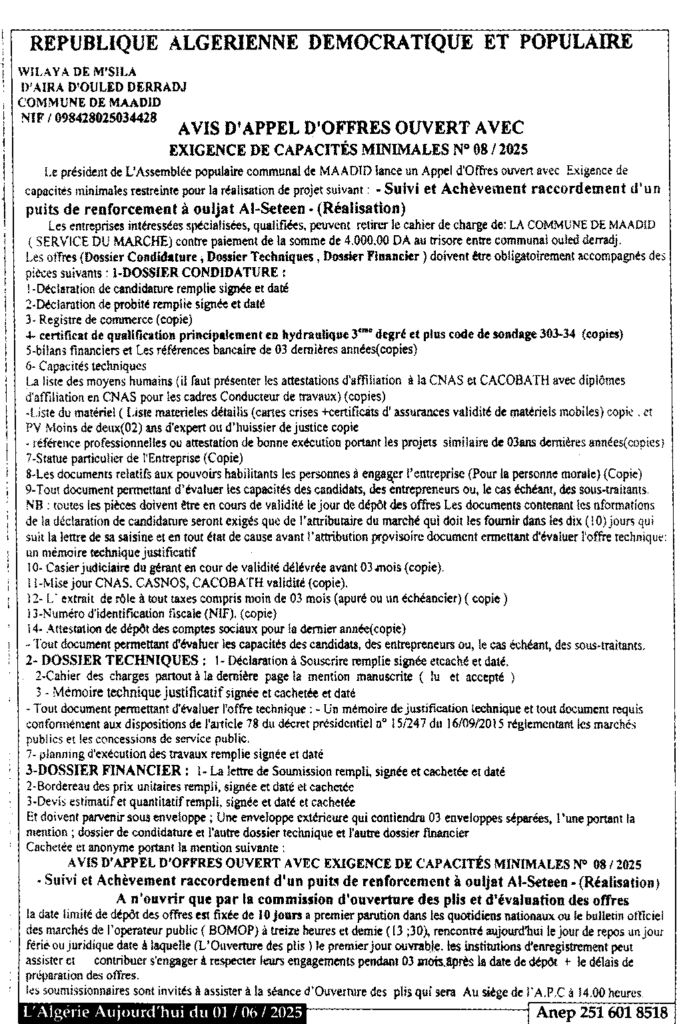 متابعة وانجاز بئر تدعيمي بولجة الستين (الانجاز)1 يونيو، 20250 15 شاركها فيسبوك X مشاركة عبر البريد طباعة