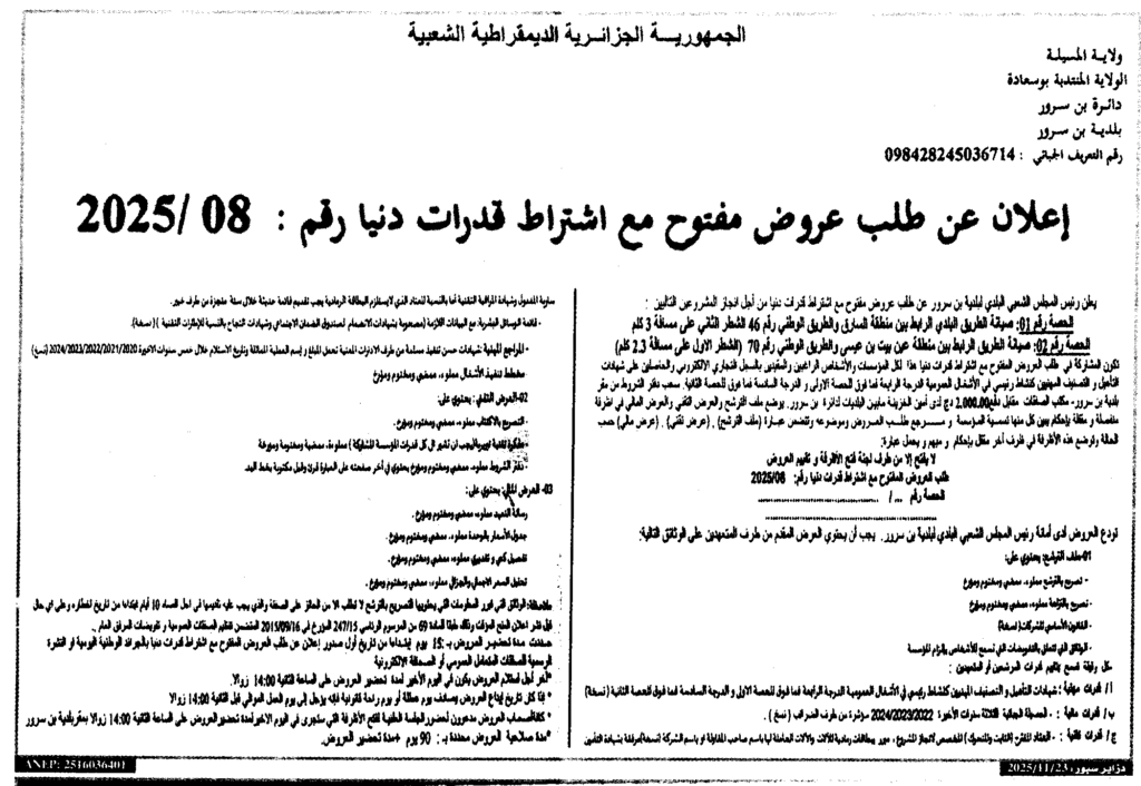 إعلان عن طلب عروض مفتوح 2025/08 بلدية بن سرور