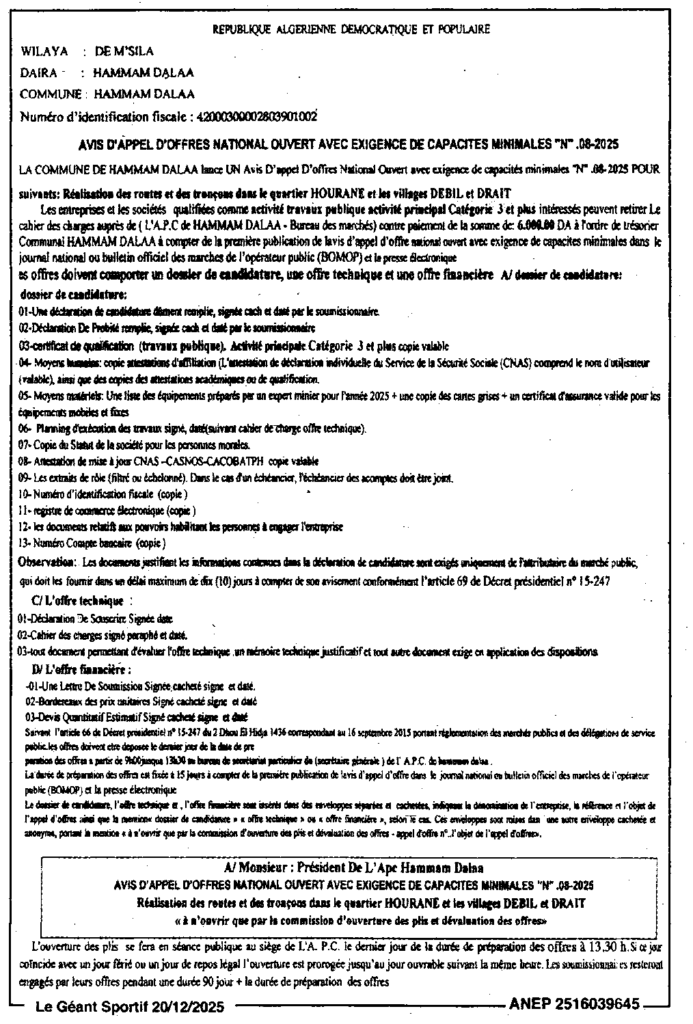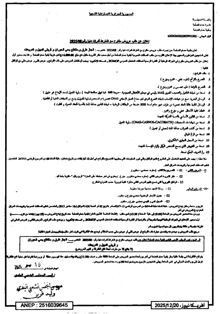 إعلان عن طلب عروض مفتوح 2025/08 بلدية حمام الضلعة