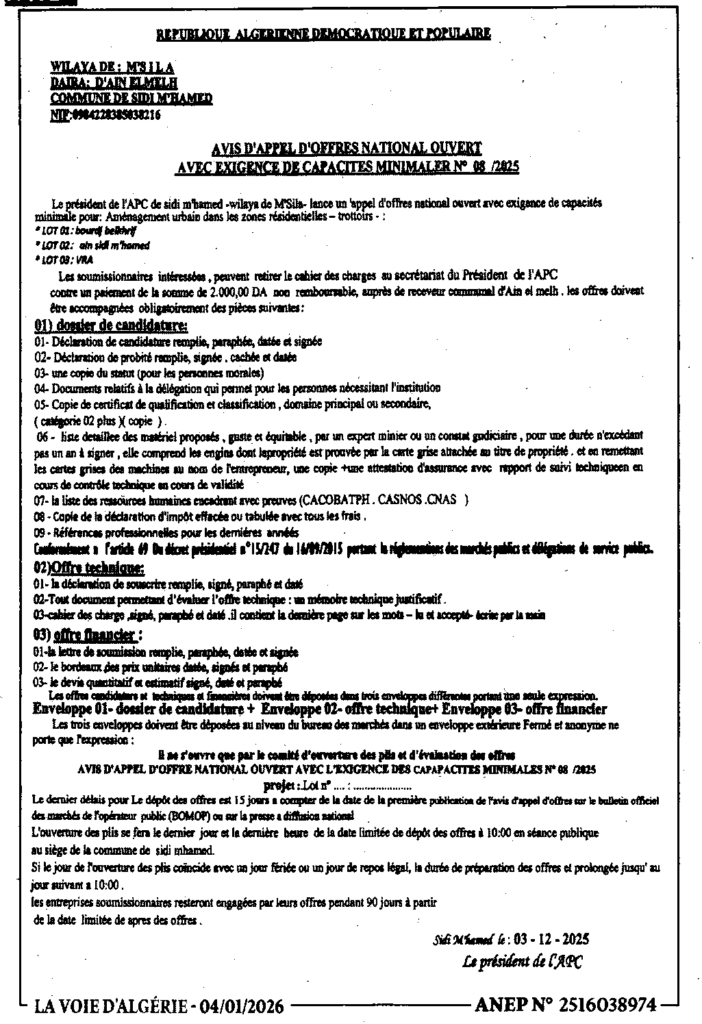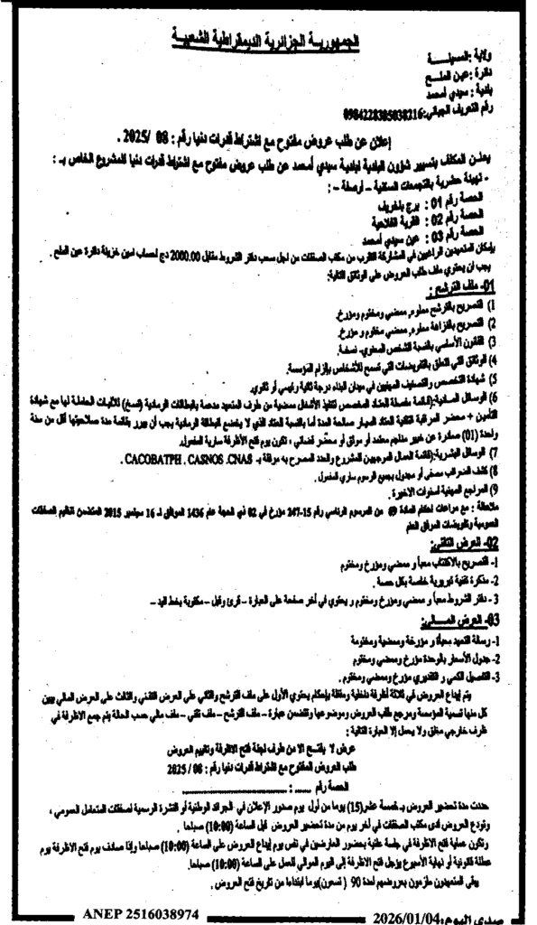 إعلان عن طلب عروض مفتوح 2025/08 بلدية سيدي امحمد