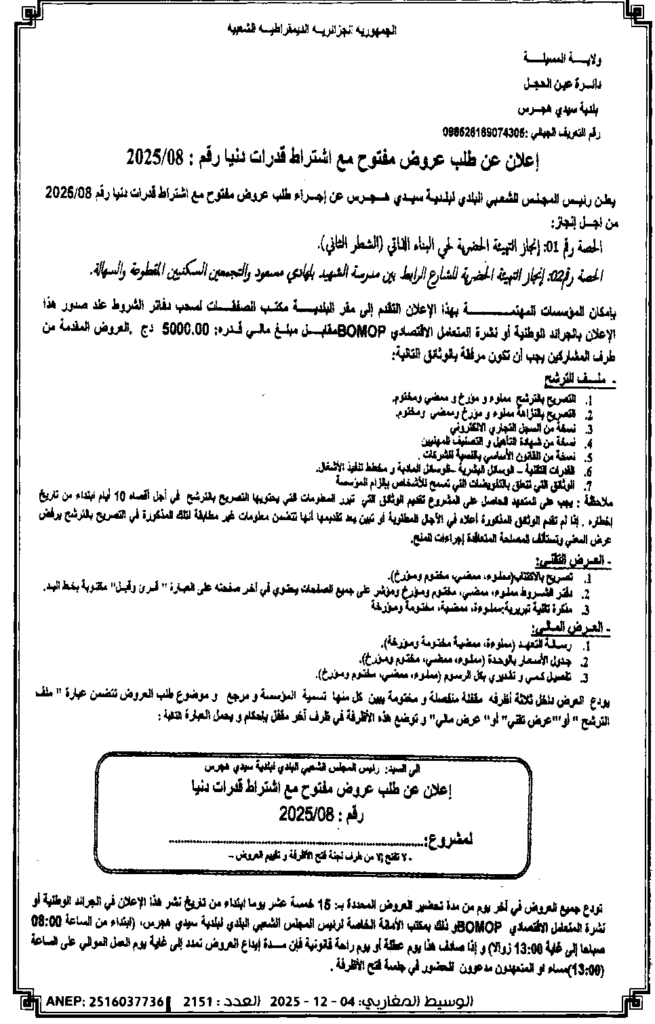 إعلان عن طلب عروض مفتوح 2025/08 بلدية سيدي هجرس