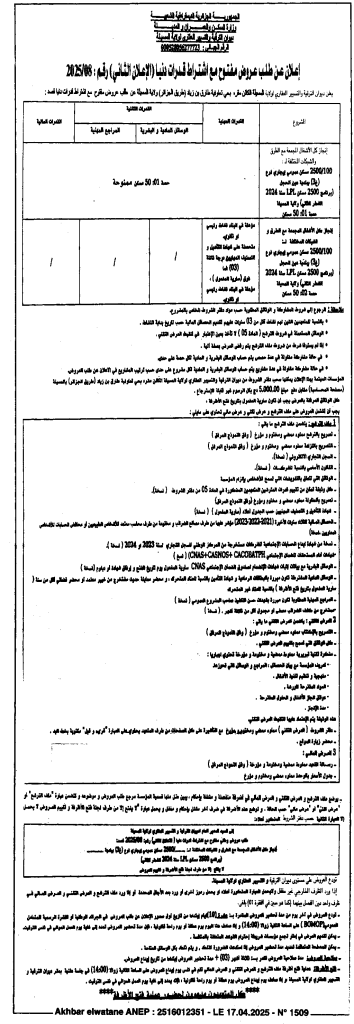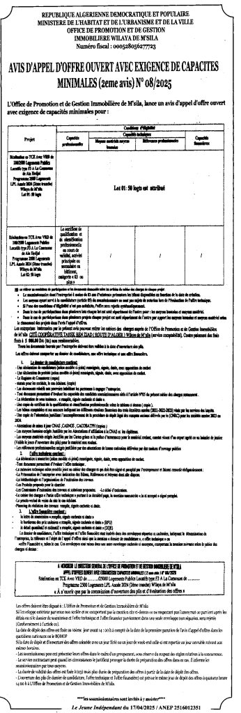 إعلان عن طلب عروض مفتوح 2025/08 ديوان الترقية والتسيير العقاري لولاية المسيلة