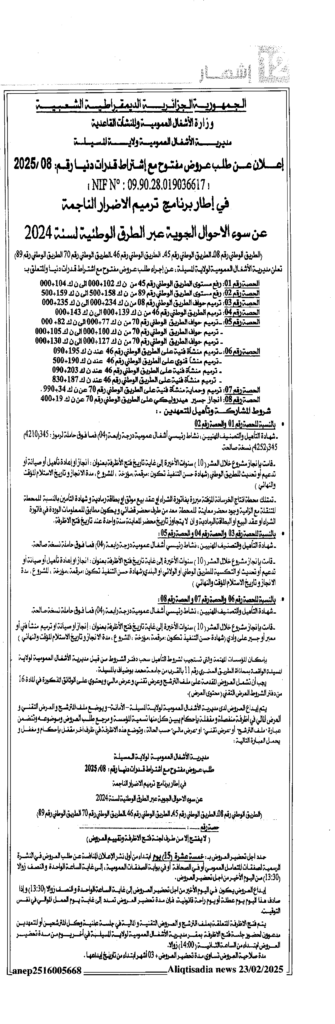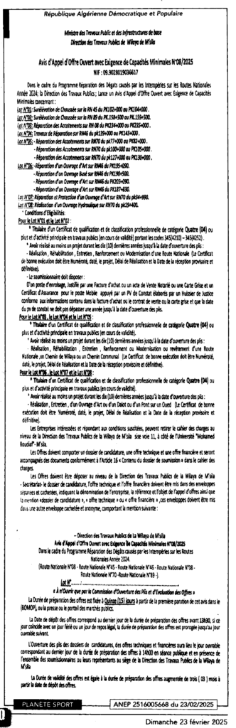 إعلان عن طلب عروض مفتوح 2025/08 مديرية الاشغال العمومية لولاية المسيلة