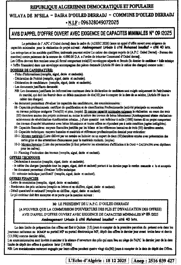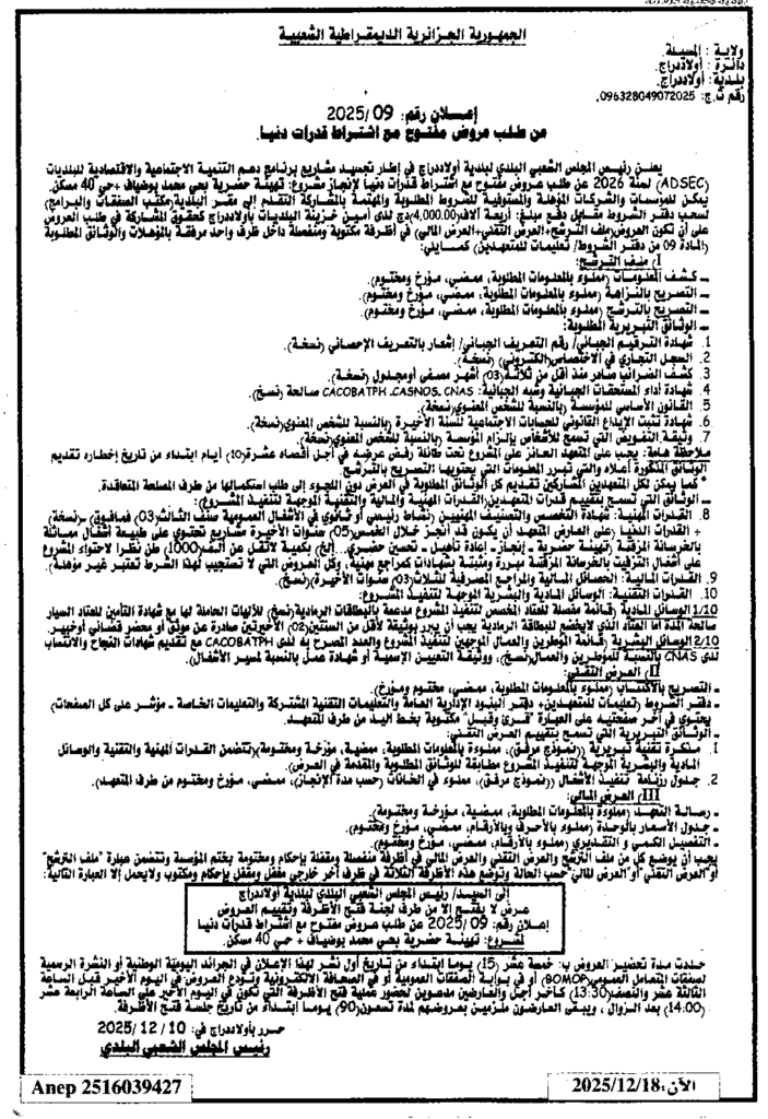 إعلان عن طلب عروض مفتوح 2025/09 بلدية أولاد دراج