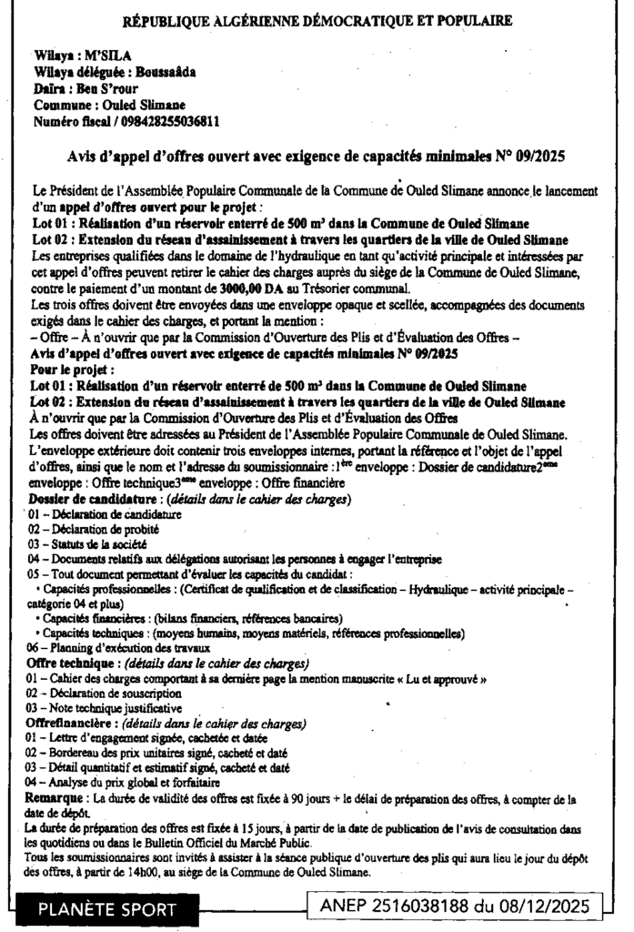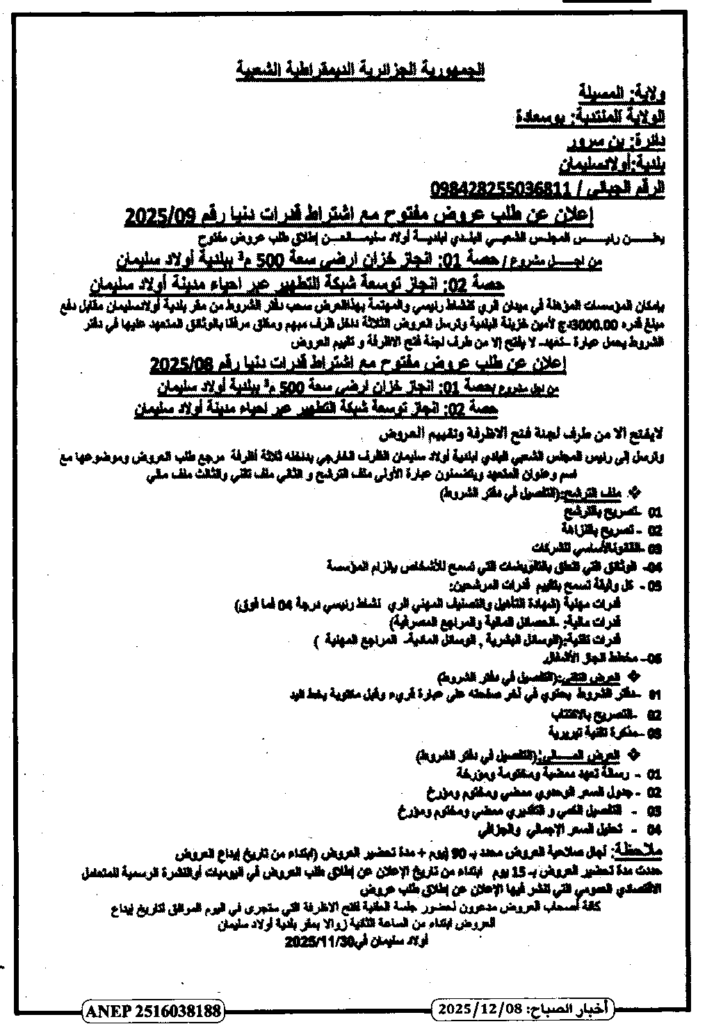 إعلان عن طلب عروض مفتوح 2025/09 بلدية أولاد سليمان