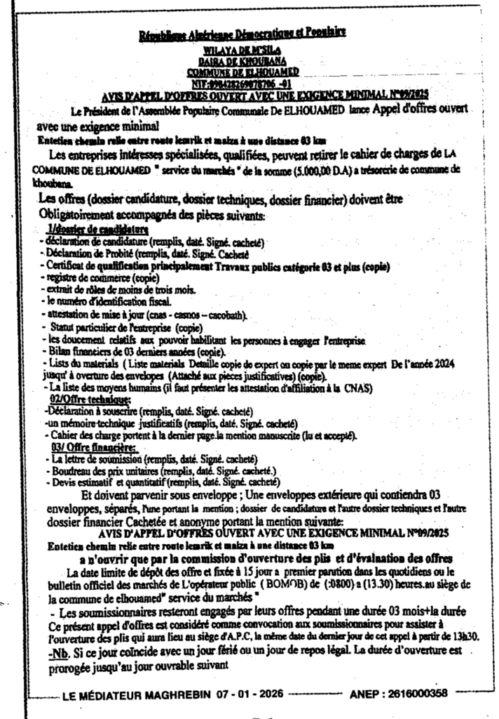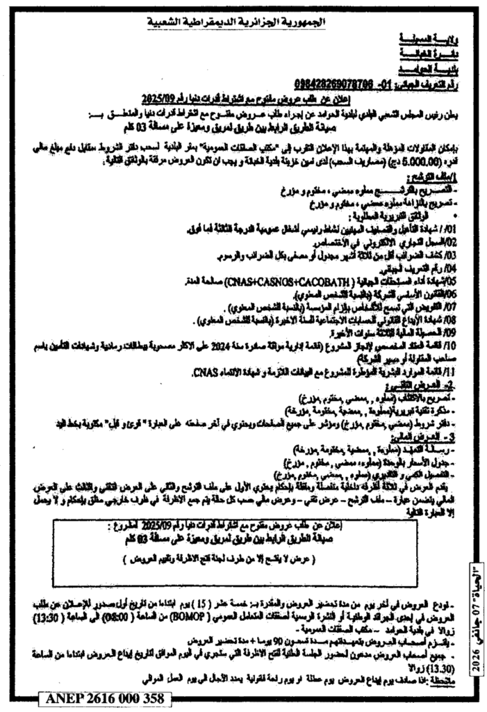 إعلان عن طلب عروض مفتوح 2025/09 بلدية الحوامد