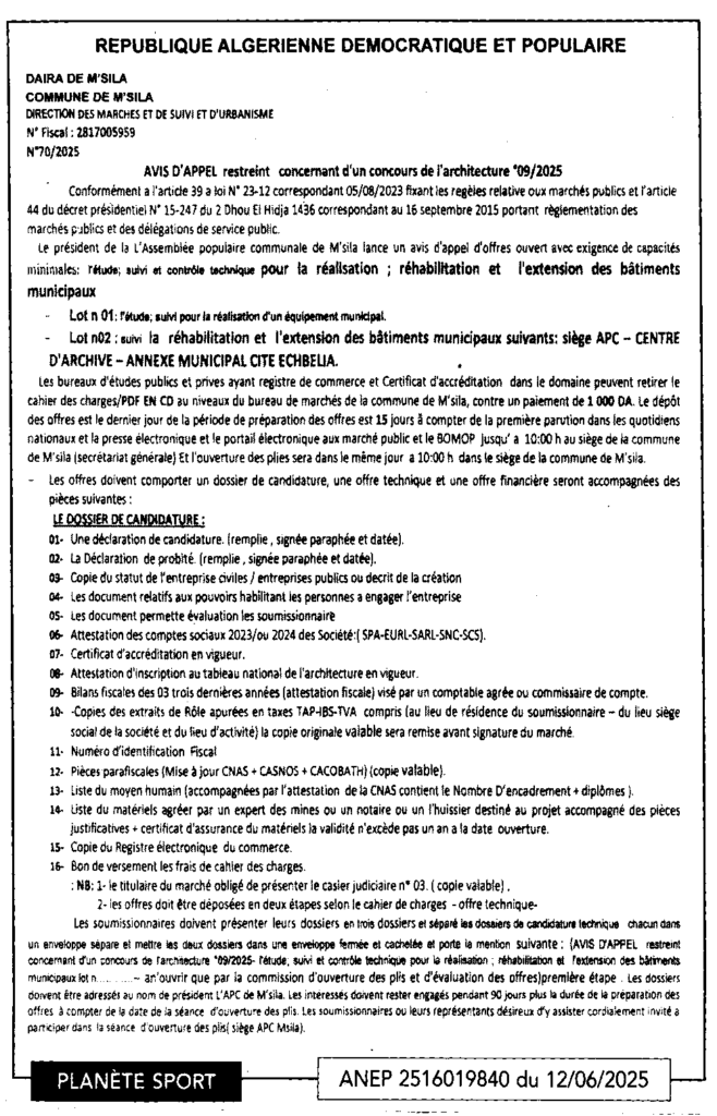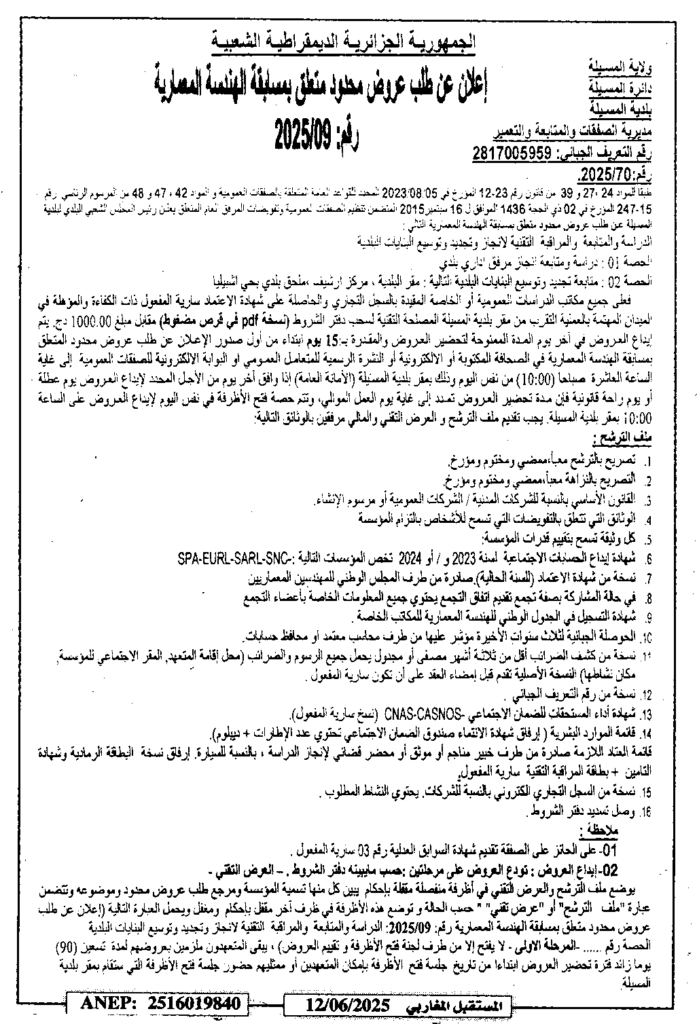 الدراسة والمتابعة والمراقبة التقنية لانجاز وتجديد وتوسيع البنايات البلدية12 يونيو، 20250 12 شاركها فيسبوك X مشاركة عبر البريد طباعة