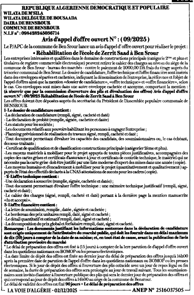 إعلان عن طلب عروض مفتوح 2025/09 بلدية بن سرور