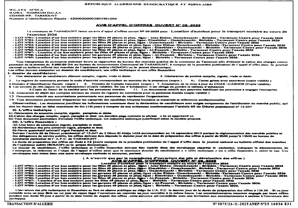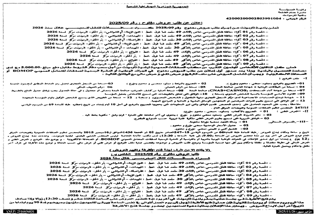 إعلان عن طلب عروض مفتوح 2025/09 بلدية تارمونت