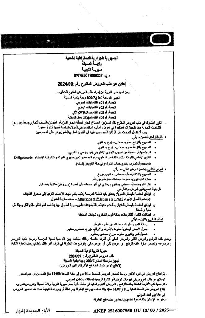 إعلان عن طلب عروض مفتوح 2025/09 مديرية التربية لولاية المسيلة