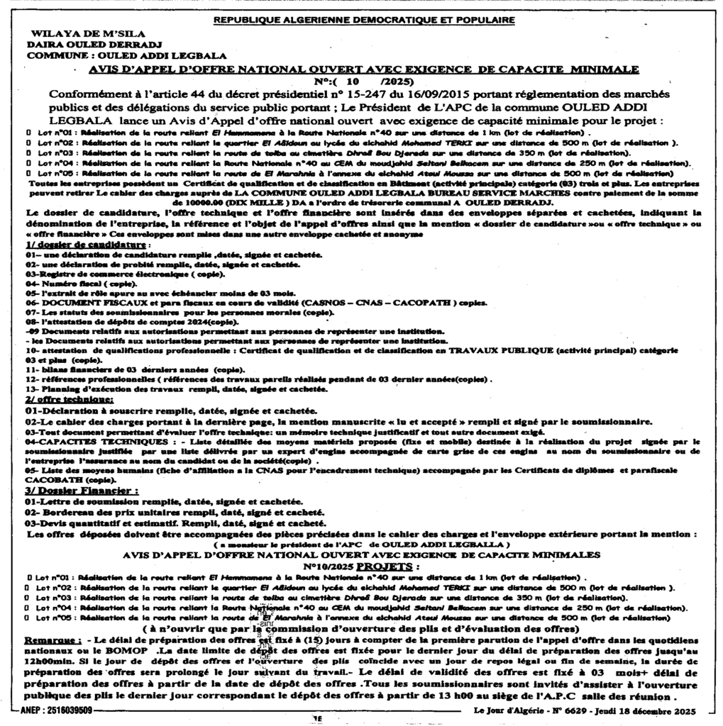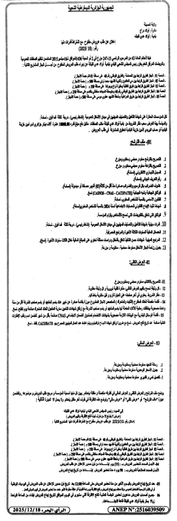 إعلان عن طلب عروض مفتوح 2025/10 بلدية أولاد عدي القبالة