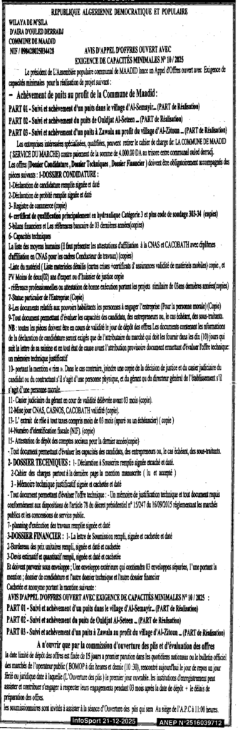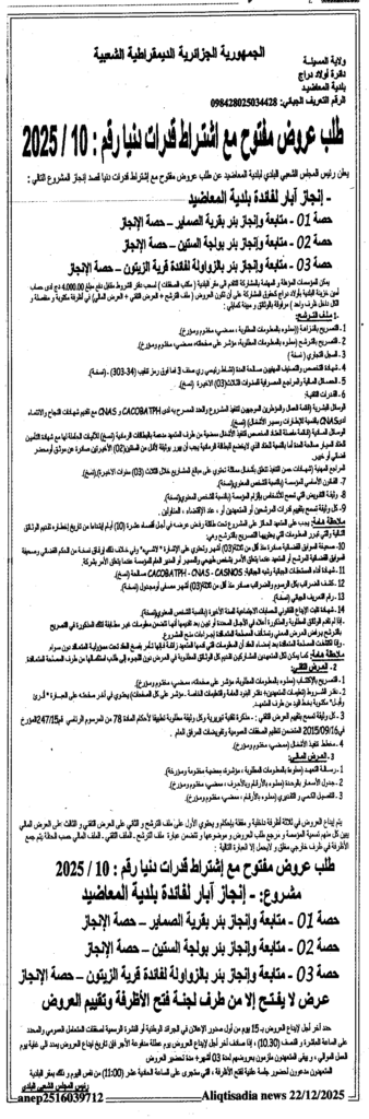 إعلان عن طلب عروض مفتوح 2025/10 بلدية المعاضيد