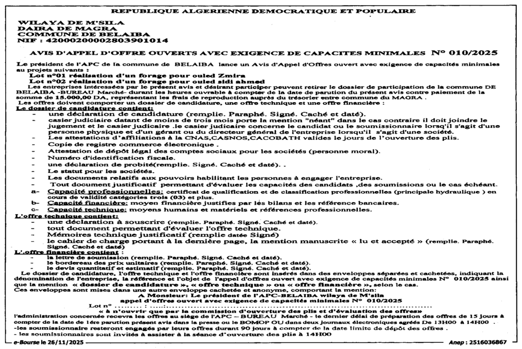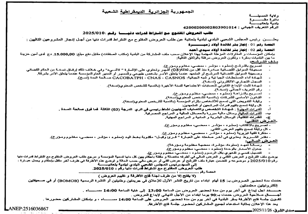 إعلان عن طلب عروض مفتوح 2025/10 بلدية بلعايبة