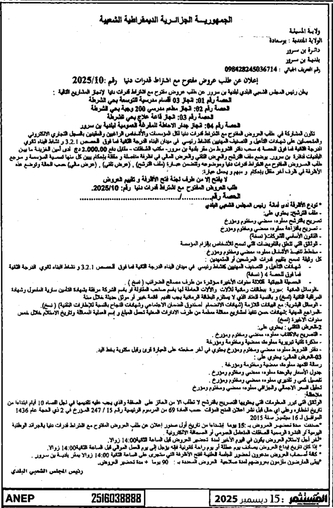 إعلان عن طلب عروض مفتوح 2025/10 بلدية بن سرور