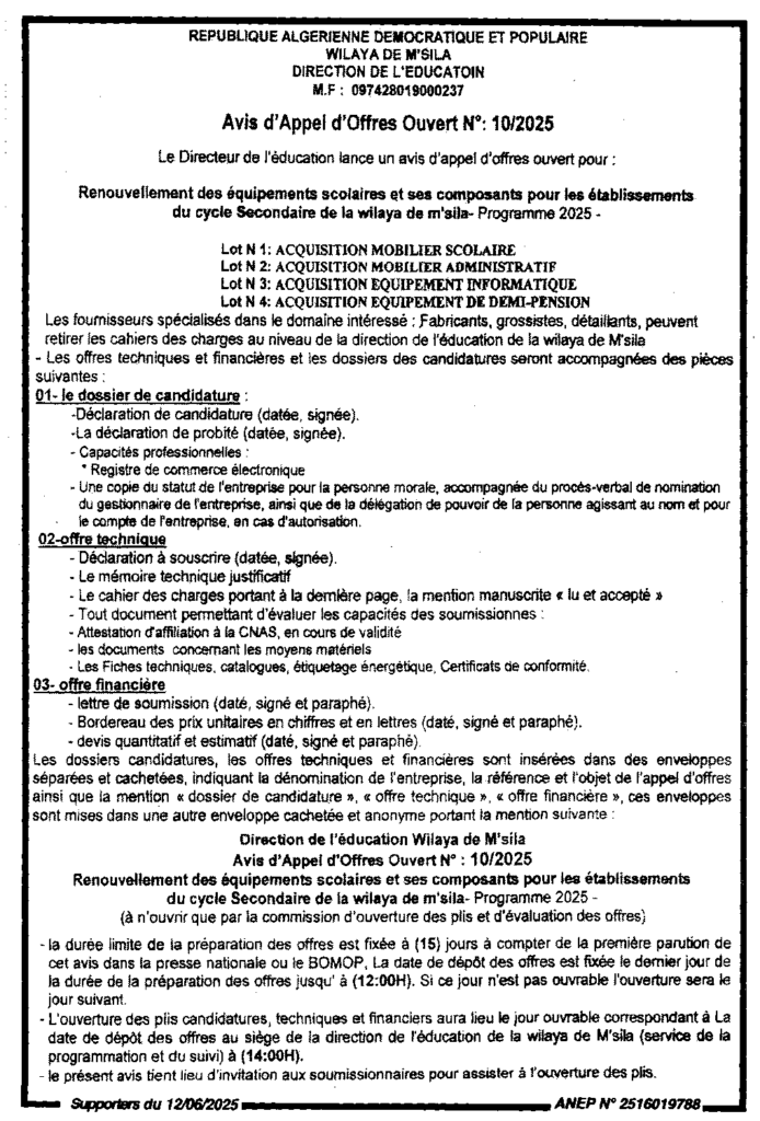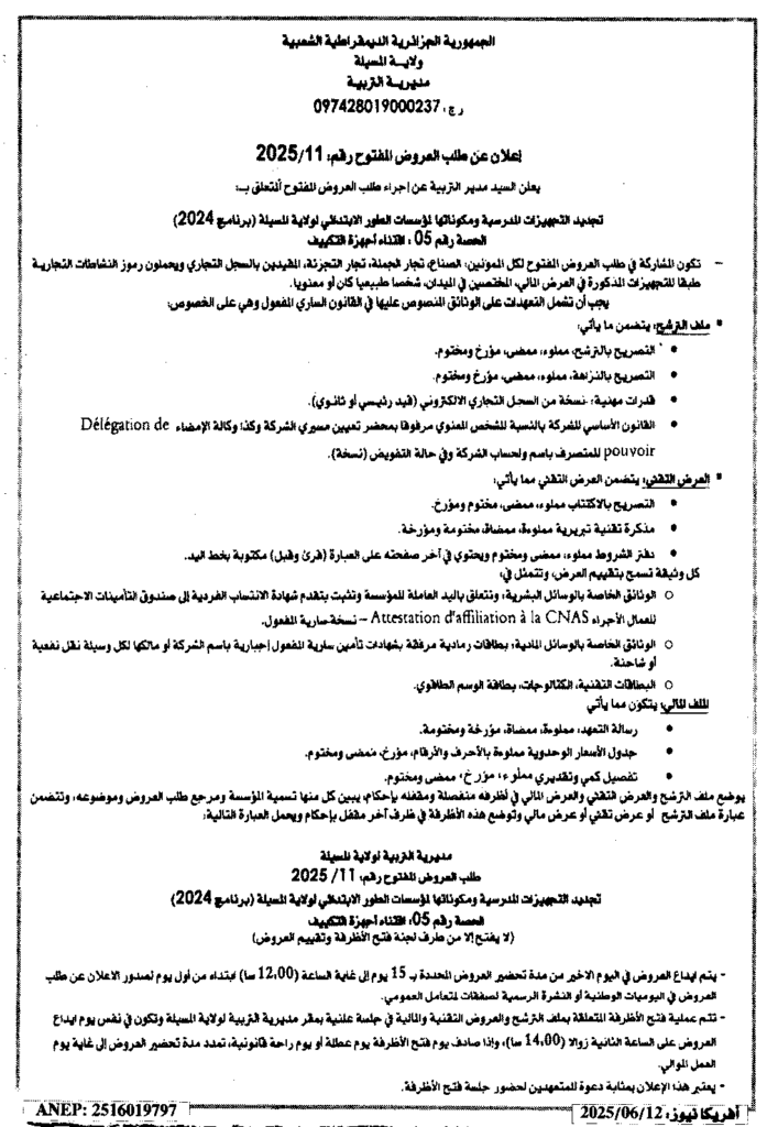 تجديد التجهيزات المدرسية ومكوناتها لمؤسسات الطور الابتدائي لولاية المسيلة (برنامج 2024)12 يونيو، 20250 29 شاركها فيسبوك X مشاركة عبر البريد طباعة