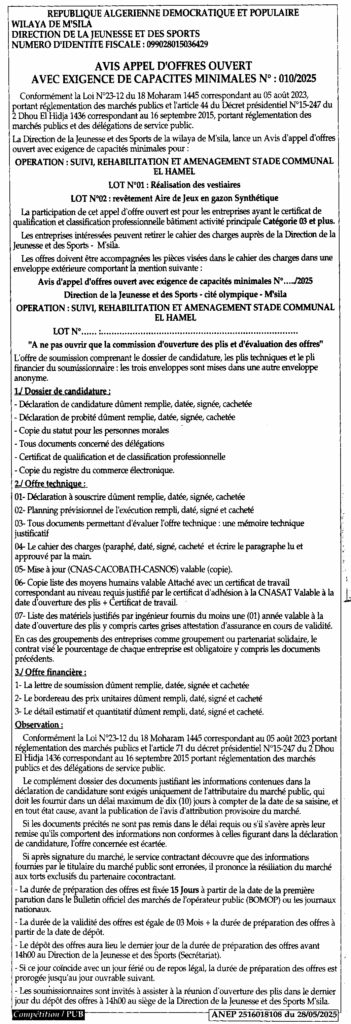 إعادة تأهيل وتهيئة الملعب البلدي لبلدية الهامل28 مايو، 20250 24 شاركها فيسبوك X مشاركة عبر البريد طباعة