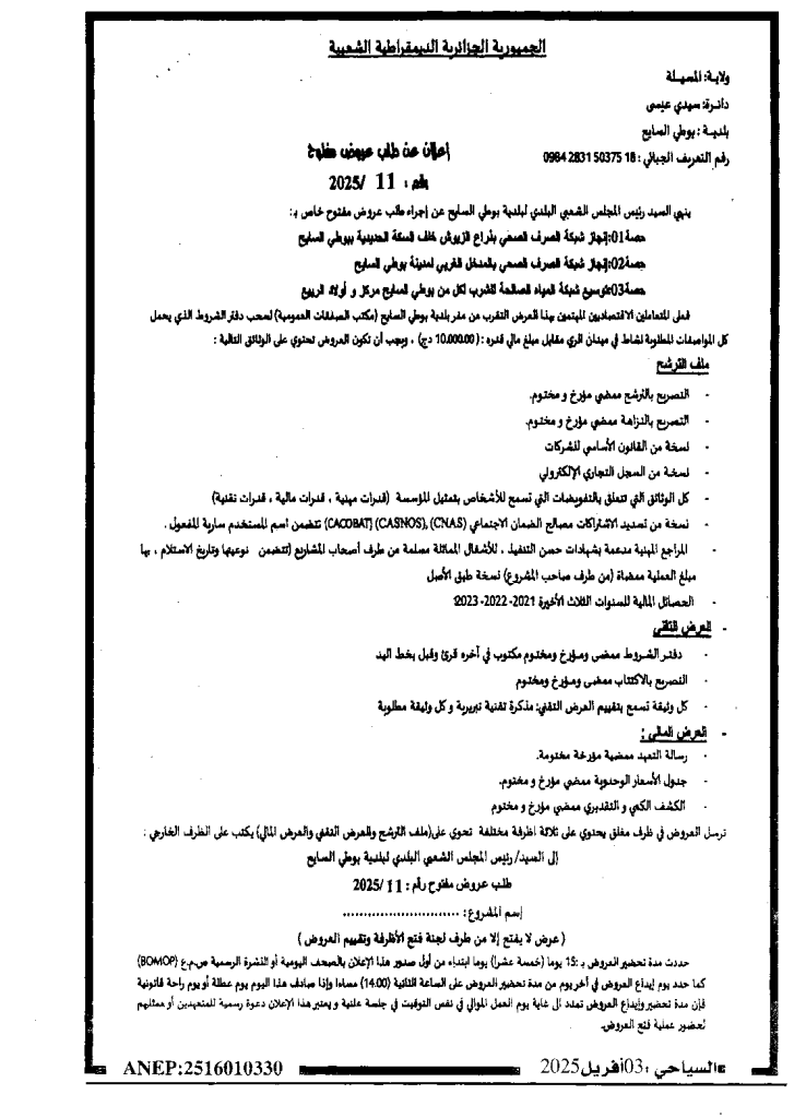 إعلان عن طلب عروض مفتوح 2025/11 بلدية بوطي السايح
