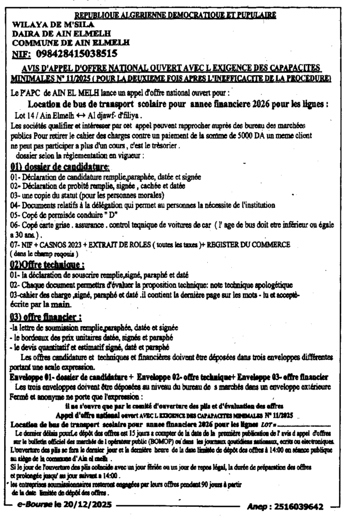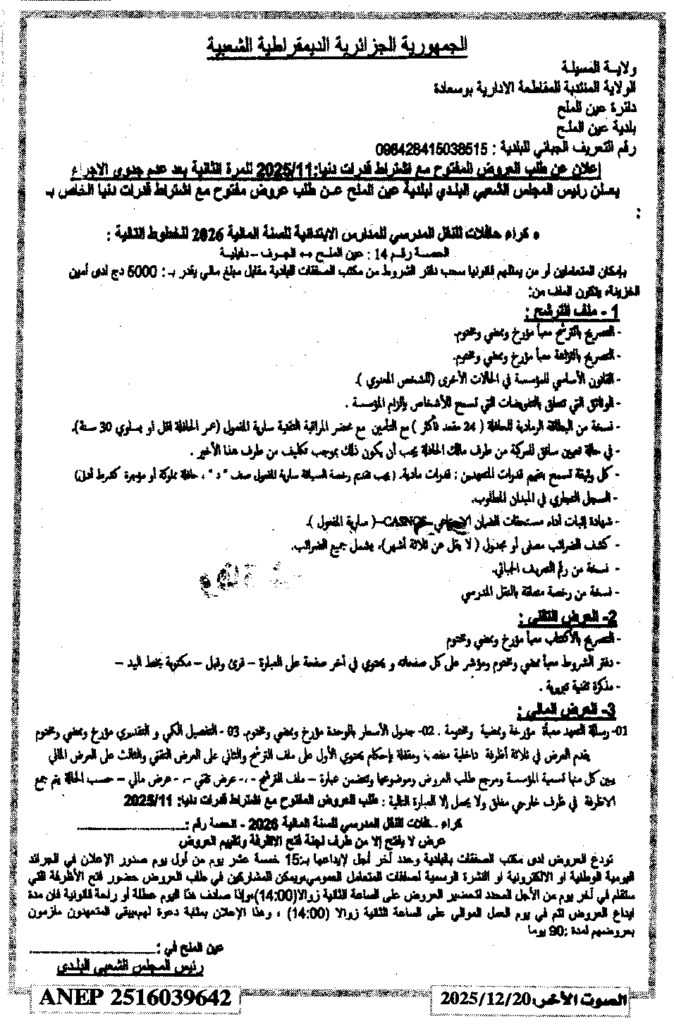 إعلان عن طلب عروض مفتوح 2025/11 للمرة الثانية بعد عدم جدوى الاجراء/ بلدية عين الملح