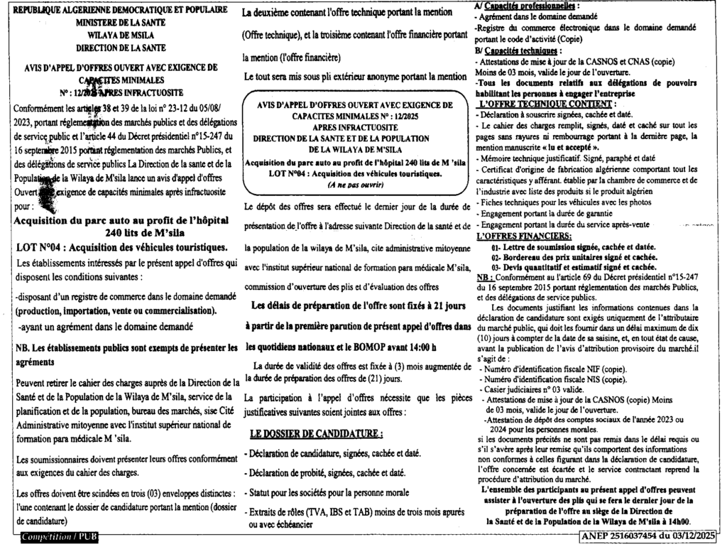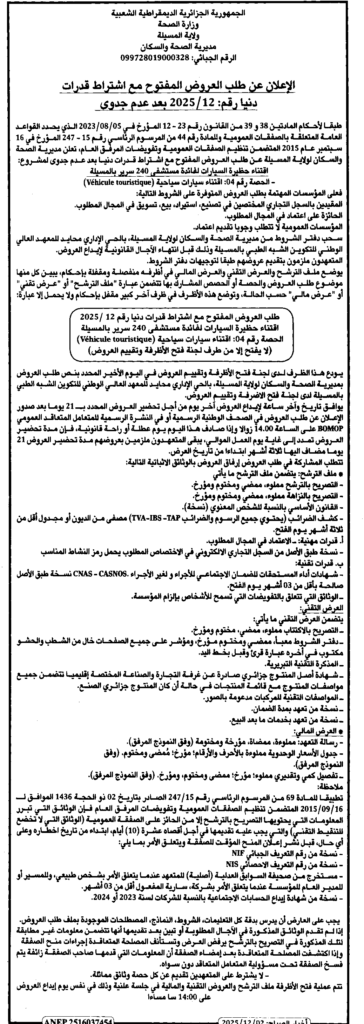 إعلان عن طلب عروض مفتوح 2025/12 بعد عدم جدوى/ مديرية الصحة والسكان لولاية المسيلة