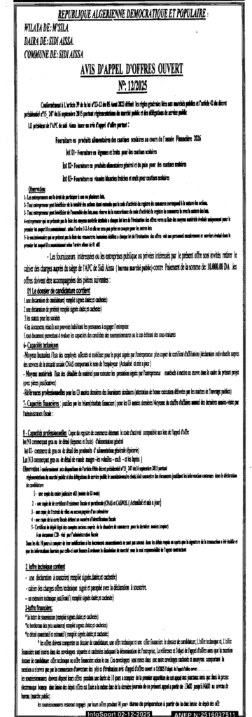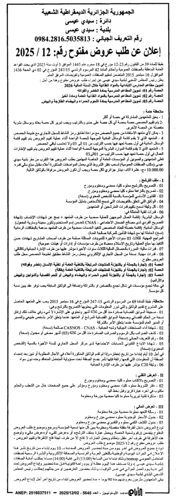 إعلان عن طلب عروض مفتوح 2025/12 بلدية سيدي عيسى