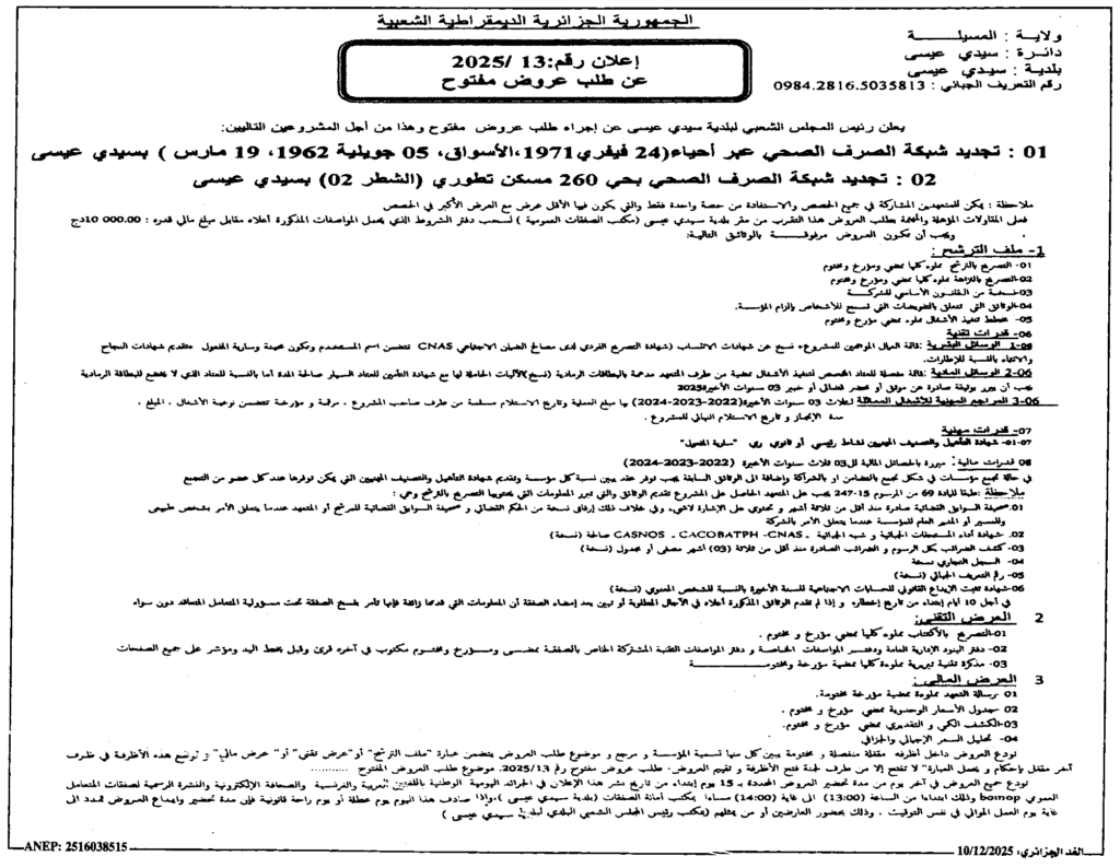 إعلان عن طلب عروض مفتوح 2025/13 بلدية سيدي عيسى