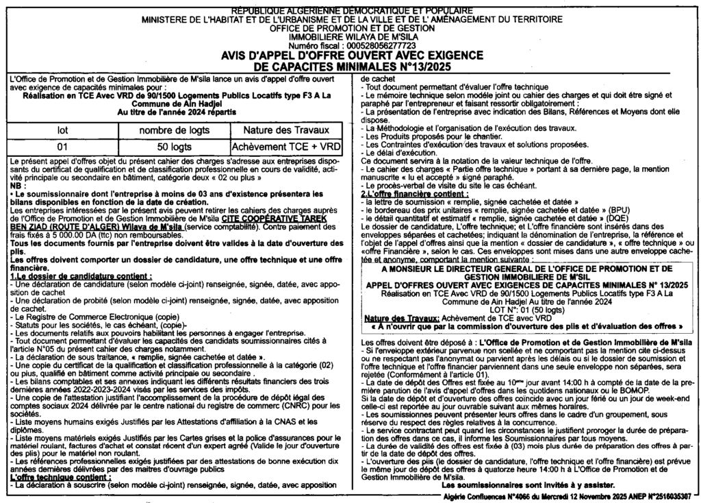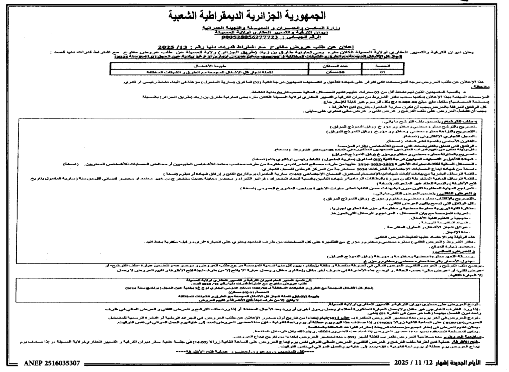 إعلان عن طلب عروض مفتوح 2025/13 ديوان الترقية والتسيير العقاري لولاية المسيلة