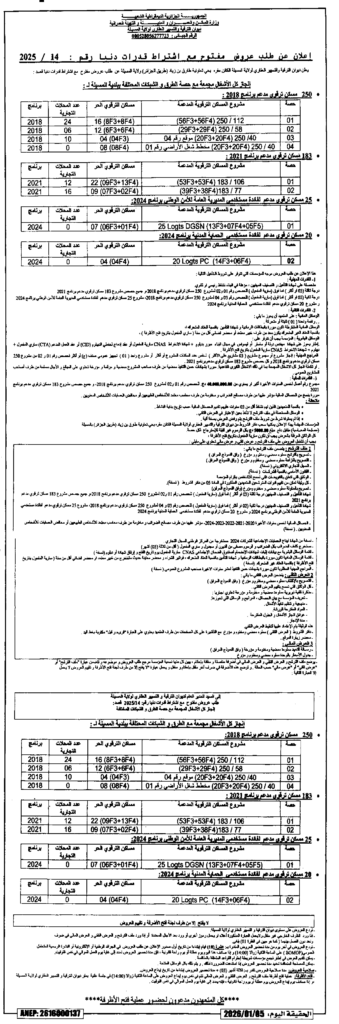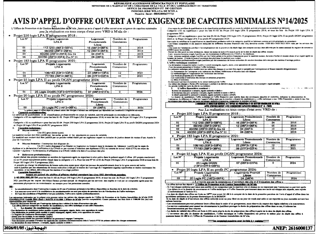 إعلان عن طلب عروض مفتوح 2025/14 ديوان الترقية والتسيير العقاري لولاية المسيلة