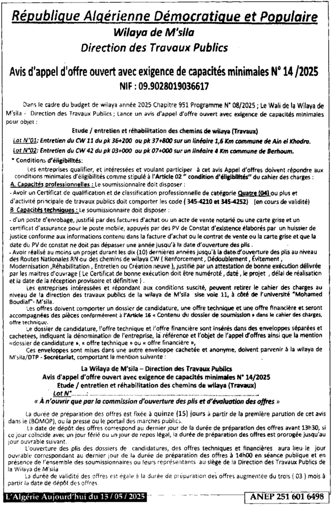 إعلان عن طلب عروض مفتوح 2025/14 مديرية الاشغال العمومية لولاية المسيلة